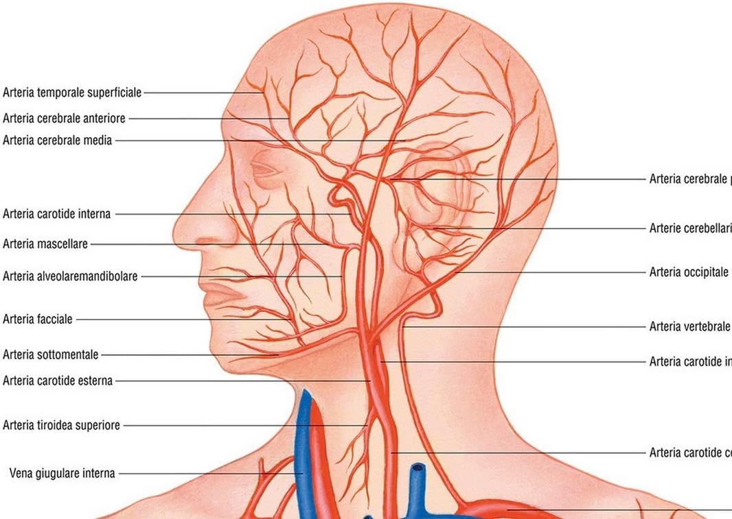 .Conosciuto anche come l'arteria mascellare interna nei libri di testo, l'arteria mascellare proviene dall'arteria carotide esterna, quindi passa attraverso la ghiandola parotide e la mandibola. In human anatomy, they arise from the common carotid arteries where these bifurcate into the internal and external carotid arteries at cervical vertebral level 3 or 4.
